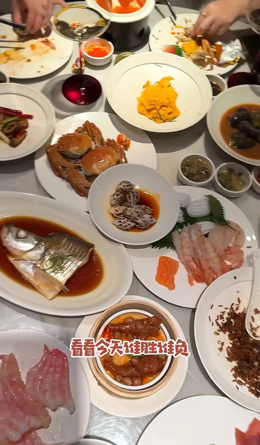 最终他们点了满满一桌子的海鲜,有大闸蟹、还有阿根廷红虾、蓝鳍金枪鱼、北海道红毛蟹等等,看着这么多海鲜,就让人眼馋,菜品真是太丰富了。