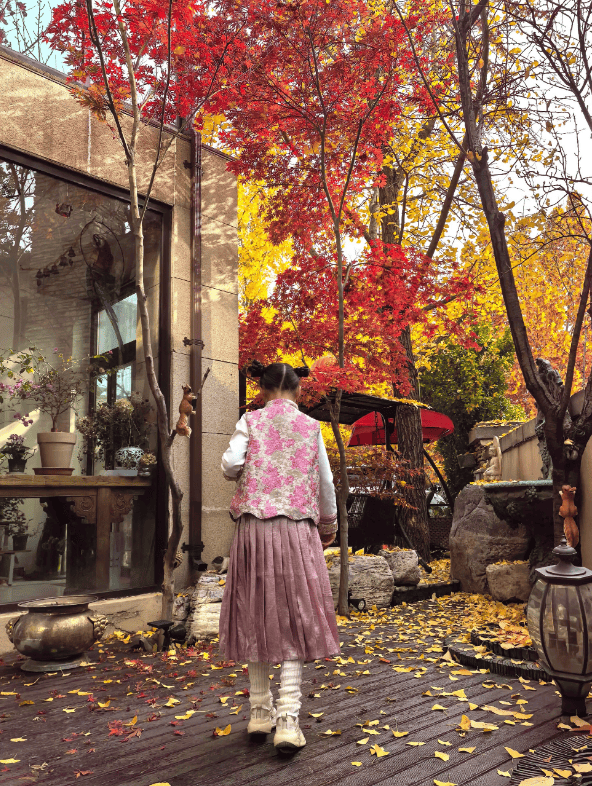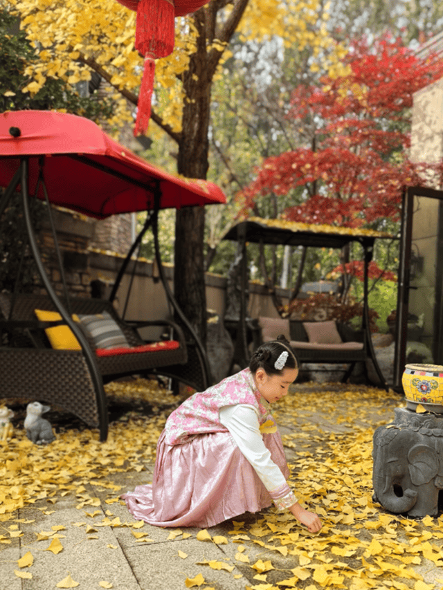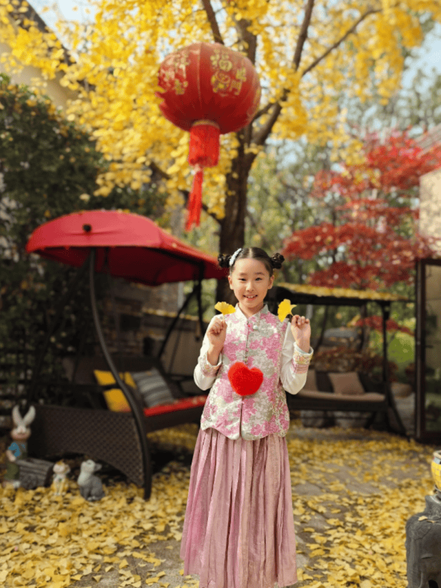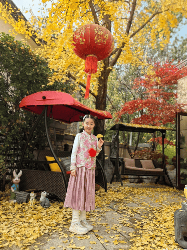 这不,张丹露就带着9岁大的小女儿luna到院子里赏秋。张丹露镜头下,luna扎着精致的哪吒头,粉色系新中式穿搭好漂亮。
