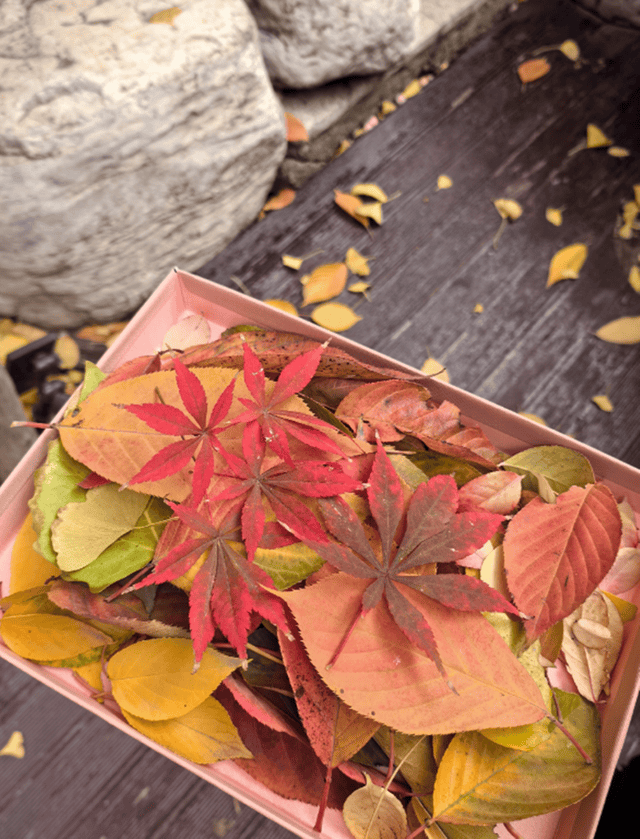 luna捡了不少漂亮的叶子,将它们放在粉色的盒子里,其中,luna还用银杏叶做了一顶头环,一看就是个心灵手巧的孩子。
