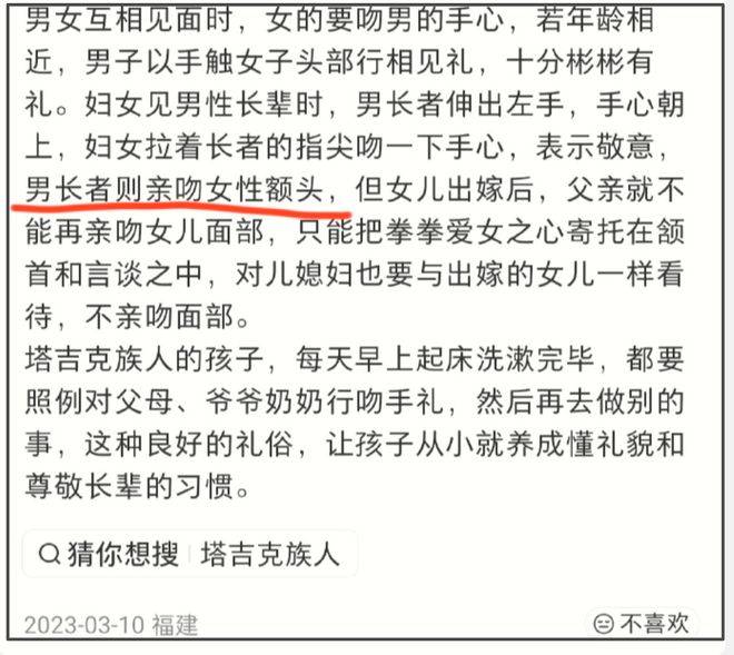 还有网友扒出当地的习俗,称男长者确实可以亲吻女性额头,但是女儿出嫁后,父亲就不能再亲吻女儿面部了。说明即便是当地的习俗,女孩长大后,也是不建议男长辈亲吻面部的。更何况沙溢和宋雨琦只是录综艺,若他真的亲吻了宋雨琦的面部,可以说很没分寸了。