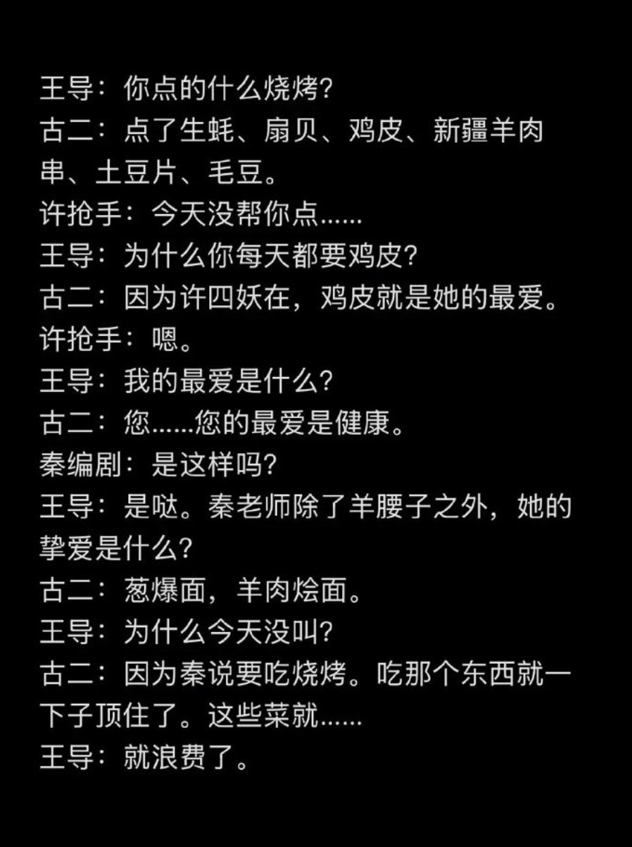 古二不分昼夜的贴身服务,给他们点烧烤,结果他们不但没有一丁点儿谢意,王家卫说话的方式和语气让人血压升高。他像对待小学生一样问古二点了什么烧烤。接着问他为什么点鸡皮,后面又问他自己最爱是什么……感觉王家卫每一句话都在审问和挑刺,古二的回答每个字都是恐惧和唯唯诺诺,生怕自己做错事、说错话。而两位编剧则在旁边看笑话和煽风点火。