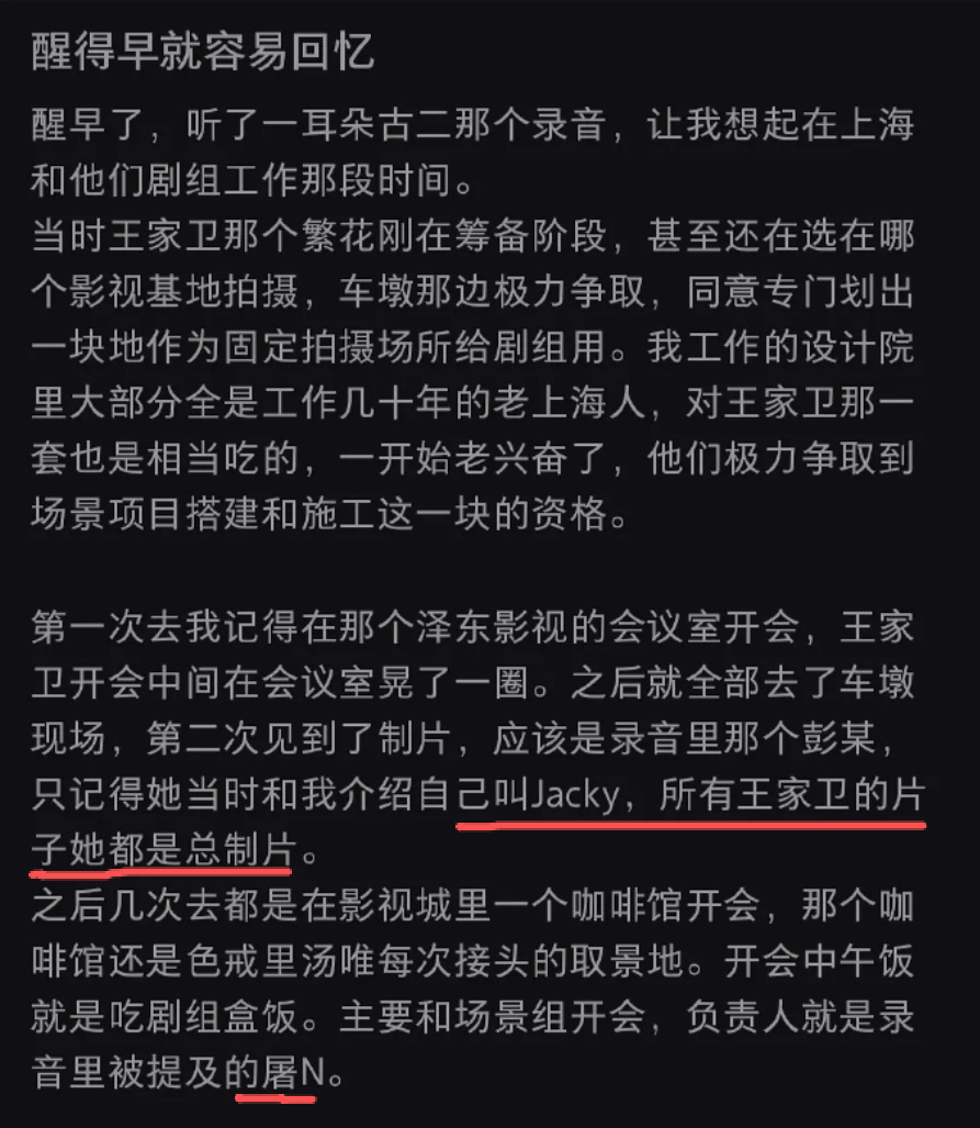 比如有建筑师爆料了和《繁花》剧组工作的经历。他工作的设计院帮助剧组完成建筑设计,敲定细节。他透露只在第一次开会中间,王家卫进去“晃了一圈”,之后的接触就转战拍摄地车墩影视城,和王家卫合作多年的制片彭绮华打交道,场景组的负责人也是电视剧的美术总监屠楠。