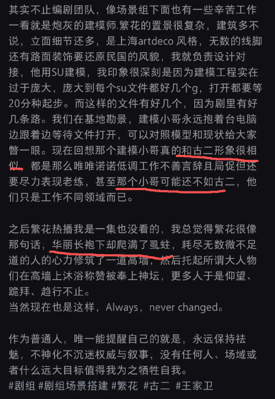建筑师的文字没有夸大其词,影视剧组要远比他看到的更残酷,不管是《繁花》剧组还是其他剧组,古二这样的人都有很多。