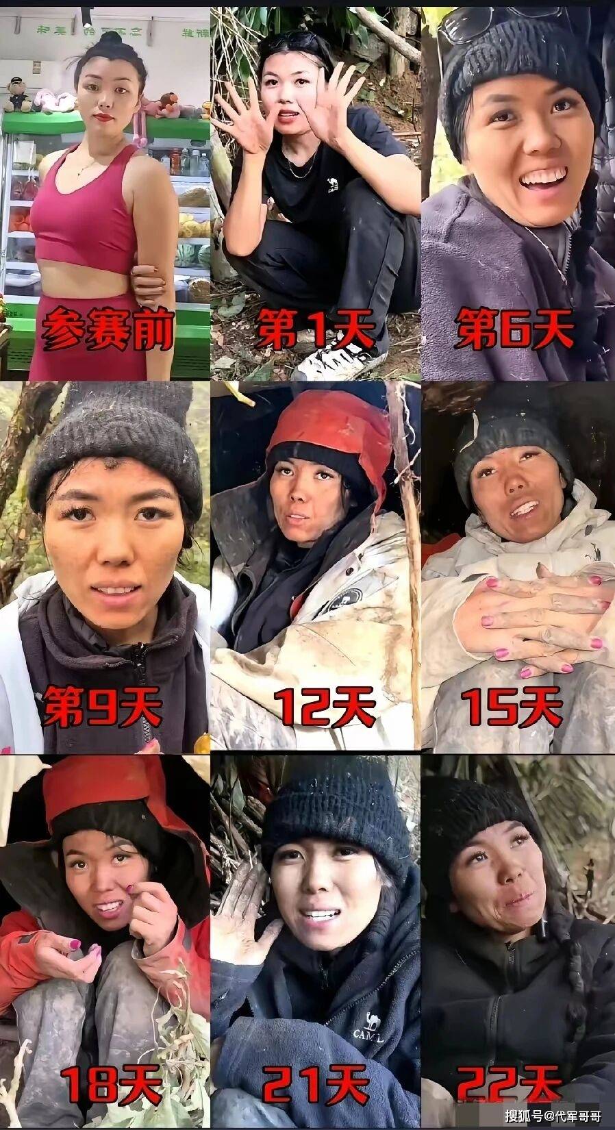 22 天前,杨朝芹还是体重 105 斤、妆容精致的都市白领;22 天后,她瘦至 93 斤,脸颊凹陷、颧骨突出,浑身裹着泥土,手指粗糙如树皮,嘴唇干裂起皮,与赛前 “丰腴貌美” 的形象