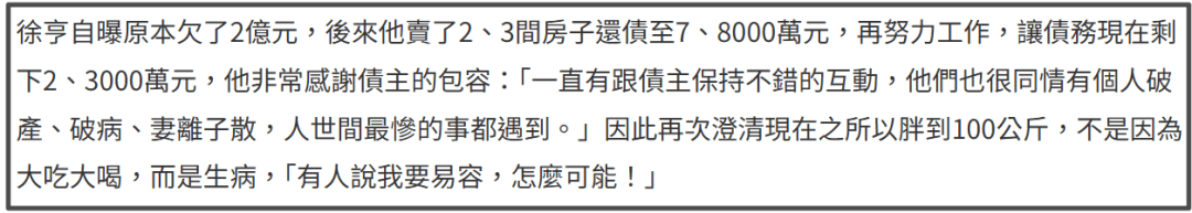 还好,徐亨还算有担当,很明显,声称因性格不合离婚,是徐亨努力保留的最后一点体面,中年夫妻无法走下去,多半是因为还不完的债,离了婚的徐亨直接净身出户,同时强调由他一人承担所有债务——此时徐亨还有2亿台币欠债没还,也就是4000多万人民币。