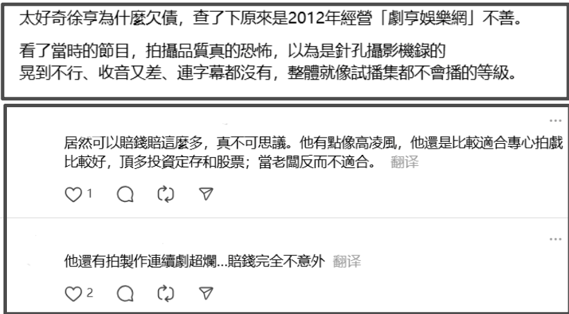 徐亨卖掉了手头仅剩的三个房产,目前租房生活,可是收入完全无法覆盖债务,这些年他一直在中国台湾省发展,台娱圈本来就愈发衰退,市场越来越小,徐亨年纪越来越大,好长一段时间都没有工作机会了。