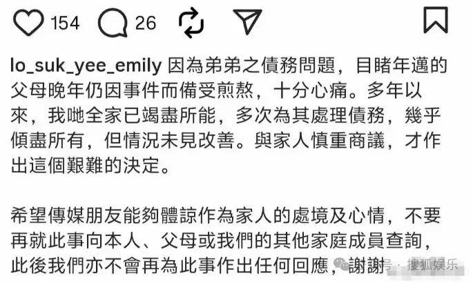 稍晚,李克勤老婆卢淑仪发文补充说明,称弟弟卢煜培债务问题严重,父母一把年纪还为此伤身劳神,实在令人心痛。