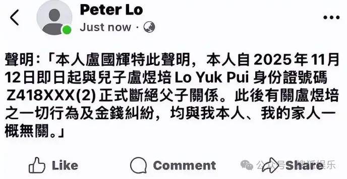 昨天,一则关于歌手李克勤的“家丑”闹得人尽皆知↓他的岳父卢国辉昨儿直接发了一则公开声明,宣布与儿子卢煜培(也就是李克勤小舅子)自2025年11月12号起,断绝父子