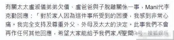 李克勤也通过经纪人霍汶希发声:确实因此困扰多年,支持太太和岳父岳母的决定↓