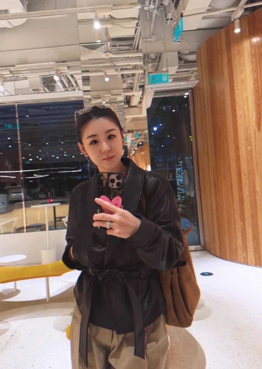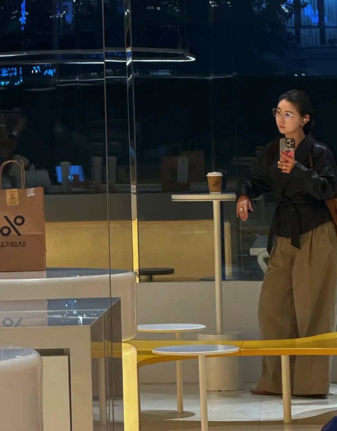 李小萌一个人逛街、喝咖啡,日子非常惬意。她穿了一件黑色皮衣,配了卡其色的直筒裤,简单大气。