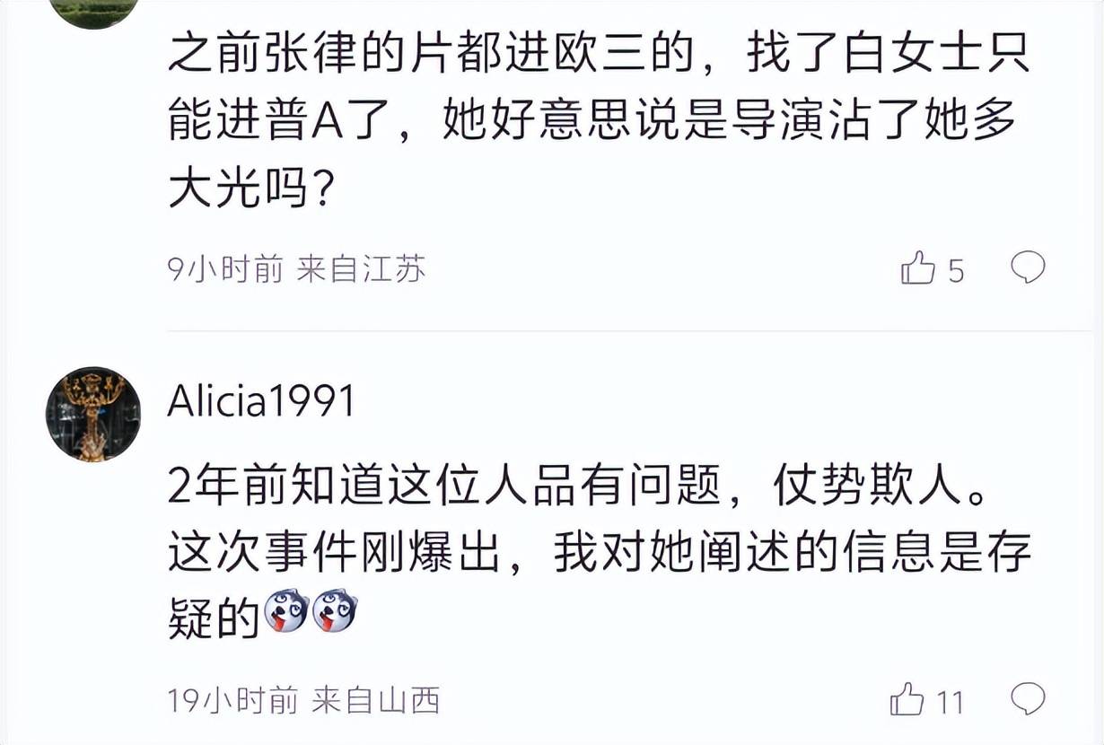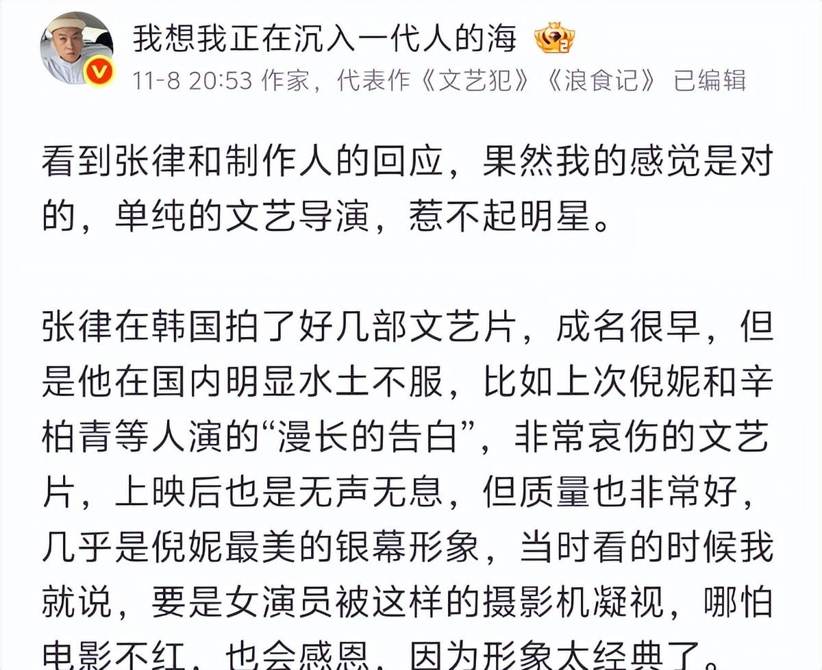 有知名作家感慨,像张律这样的文艺片导演惹不起明星,还暗示白百何该学会感恩。