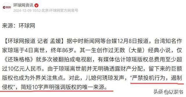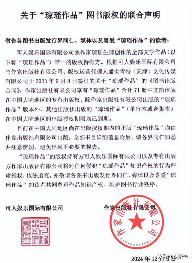 随后,她主理的可人娱乐发布声明,明确表示“已获得琼瑶生前全权授权,是所有作品唯一版权持有方”。