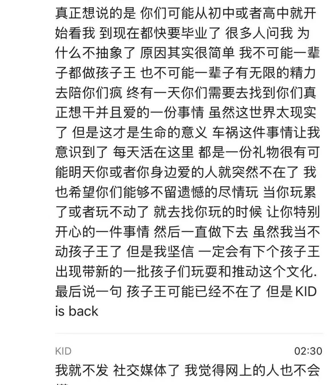 11月14日,说唱歌手孩子王发长文官宣回归,他称当时车祸后手机没了没办法联系任何人,看到自己去世消息时已经发酵完了,没有辟谣是在收集证据,和想用这段安静的时间把专辑做了。据