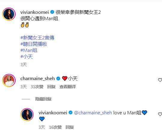 谷娅溦分享出与佘诗曼的合照后,佘诗曼还亲自留言!看来两人相处的很开心!