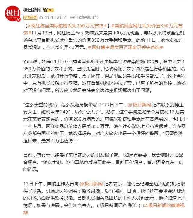 尽管各方仍在调查,首饰依旧下落不明,但蒋女士的立场十分明确:追回首饰比金钱更重要。她希望自己的遭遇能警示广大旅客,而她那句“只要能够追回来,悬赏百万也值得”,也让这起事件超越了普通的失窃案,变成了一场用巨额现金挑战跨国系统漏洞的豪赌。