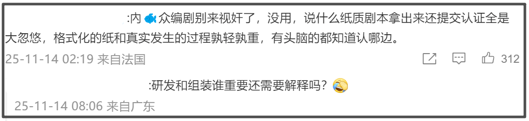 网友也看明白了,一个研发一个组装,谁重要谁该署名还需要解释吗?