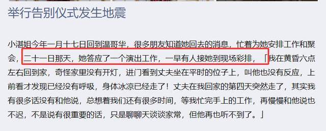 林小湛是在1月17号赶回的加拿大,很多朋友得知这一消息后便紧急安排工作与聚会。21号当天,林小湛参加了一个活动,大约下午六点多的时候回到家,因为没有开灯,所以她感到很奇怪,进门之后发现丈夫坐在椅子上且没有任何反应。