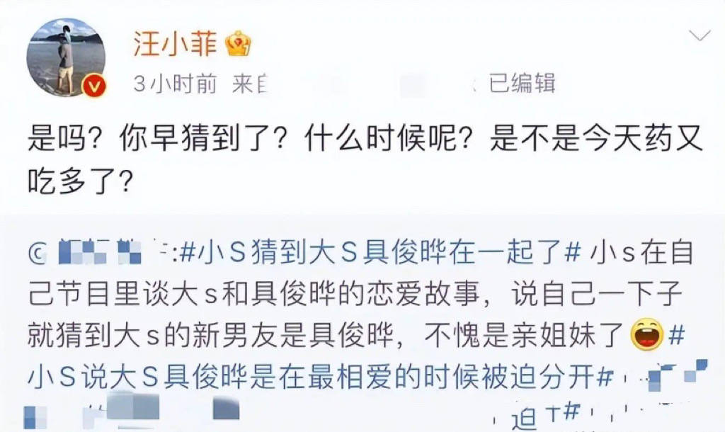 当初小S在节目中爆料,猜到了姐姐的新男友是具俊晔。汪小菲醋意大发,甚至认为是小S拆散了他们的婚姻,直言大S总有一天会舍到小S手上。