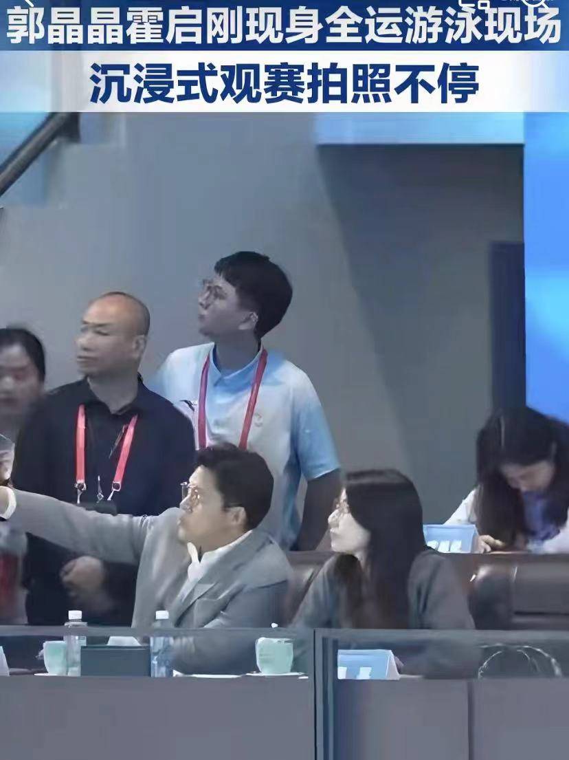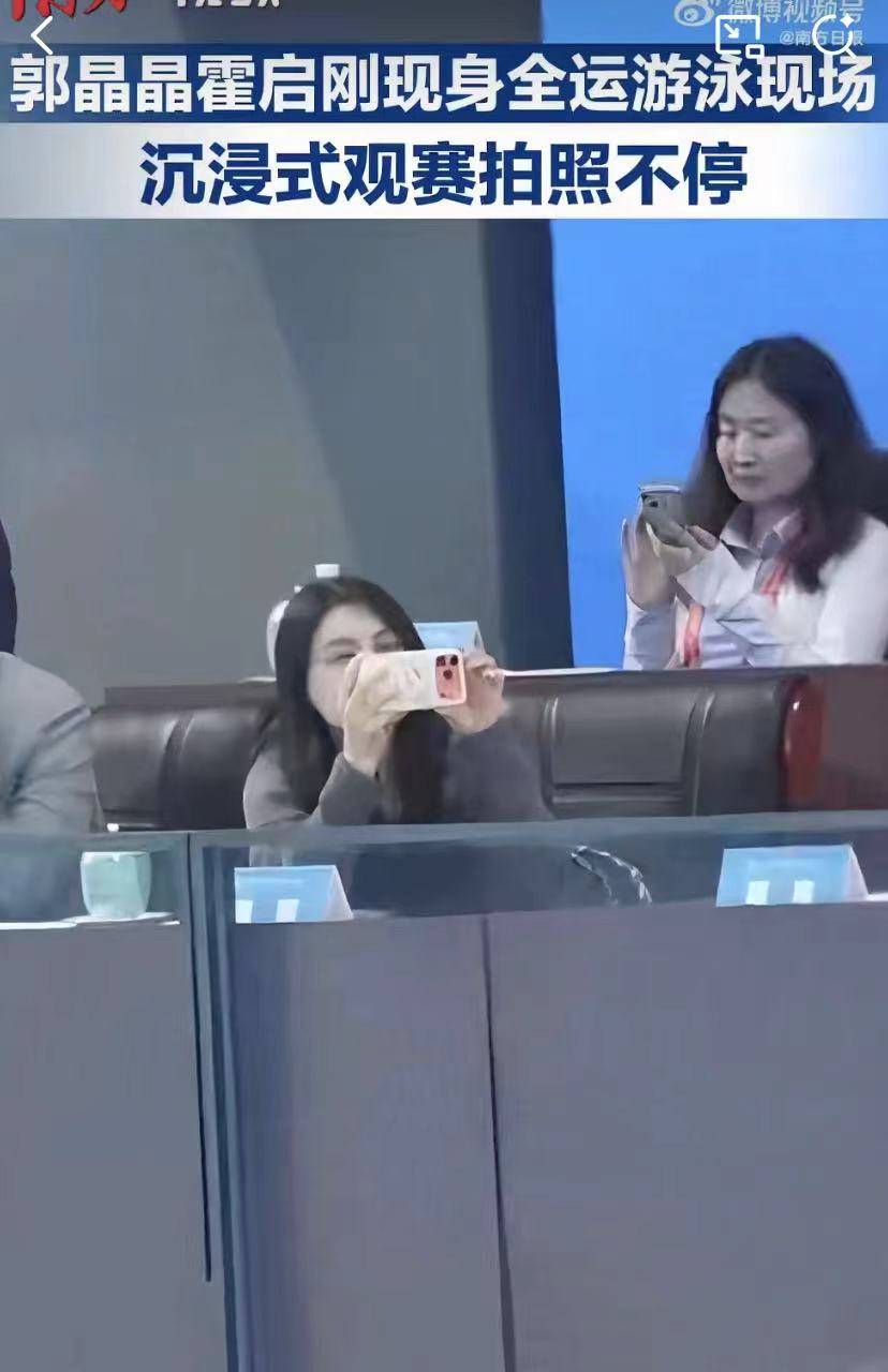 霍启刚在百忙之中和老婆郭晶晶亮相于全运会的游泳比赛,不时为运动员送上掌声,特别郭晶晶还专注拍摄视频。