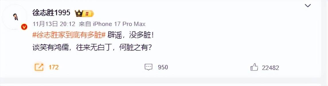 可谁能想到,徐志胜却拽起来说:“辟谣,没多脏!谈笑有鸿儒,往来无白丁,何脏之有辟谣!”其实大家都是这样1所谓‘乱’,是稿子堆得比山高;所谓‘不脏’,是外卖盒当天清,衣服攒两天也会洗。再说了,我一天赶三个通告,凌晨回家泡碗面都得站着吃,哪有那功夫把屋子收拾得跟样板间似的?”