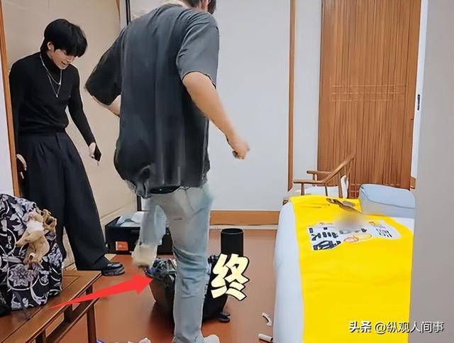 可柯淳不但没停,反而兴奋地也加入进来,俩人你一脚我一脚地踹了快20秒,直到轮子都掉了、箱子彻底变形了才住手。