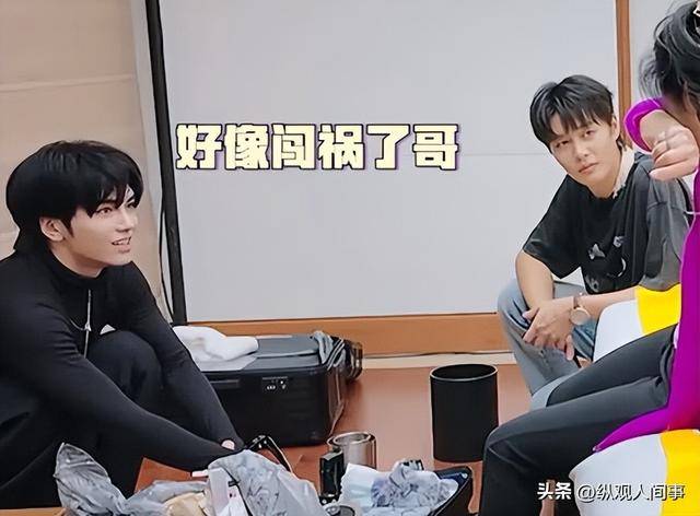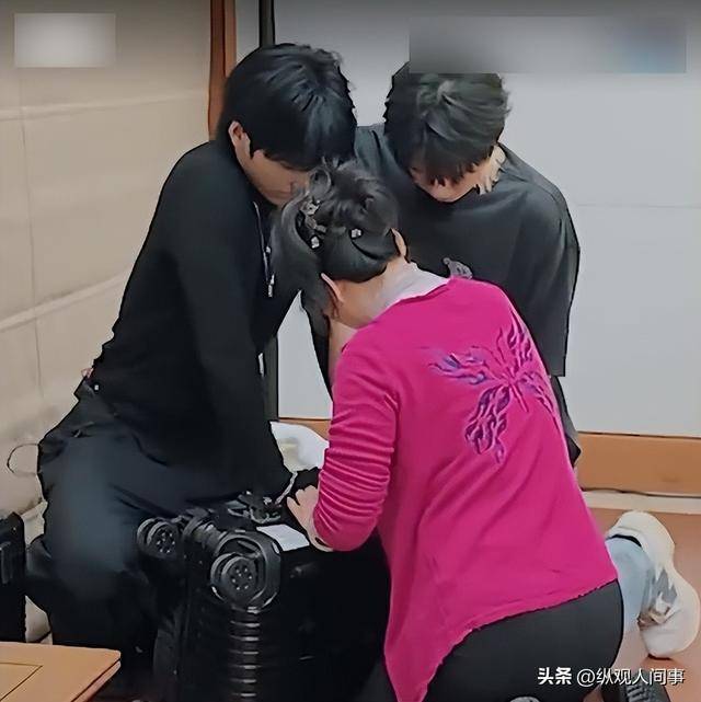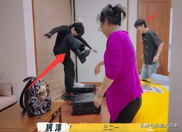 当时何赛飞的黑色行李箱突然卡住打不开了,柯淳和邵子恒这俩小伙子就自告奋勇地跑过去帮忙。