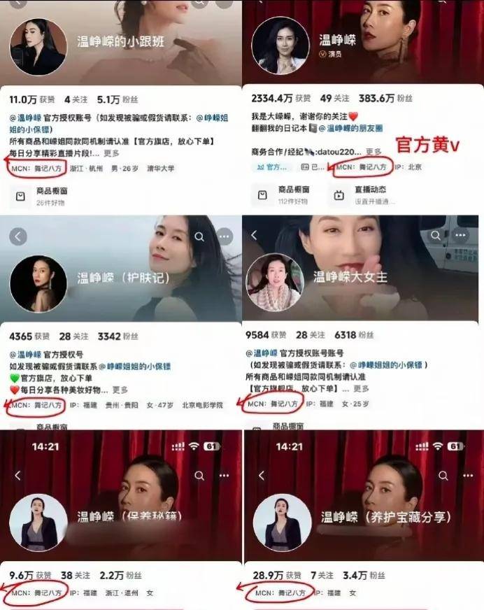 事实上,根据搜索,温峥嵘并非只有一个账号。先来看有演员认证的温峥嵘账号,主页挂了商品橱窗,有112件好物展示,显示签约的MCN公司是舞记八方。其他以温峥嵘取名的卖货账号有5个,他们的MCN公司都是舞记八方,粉丝数量从几千到几万,主页都标注有温峥嵘授权,且艾特了温峥嵘,带货品类几乎都是护肤或保养。若只是假冒行为,那么MCN为何是同一个?又是如何拿到授权的?温峥嵘又为何不直接告这些账号?平台的监管又为何失效?