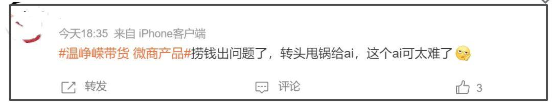 支持AI盗脸侵权维权,但若想把所有的带货都甩锅给AI,那就显得太急功近利。只要合法带货赚钱并不丢人,但若曾经有带过不好的产品,火了想撇清干系那就行不通,温峥嵘这波舆论翻车就是小瞧了互联网的扒皮能力,做人还是真诚一点吧。