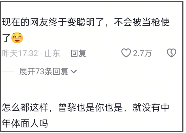 看温峥嵘最新的社媒动态,分享的内容是热门舞蹈,评论区却都是吐槽声,纷纷表示网友都很聪明,不会被当枪使,讽刺温峥嵘把网友当傻子,还有的斥责她为何不能当个体面的中年人。