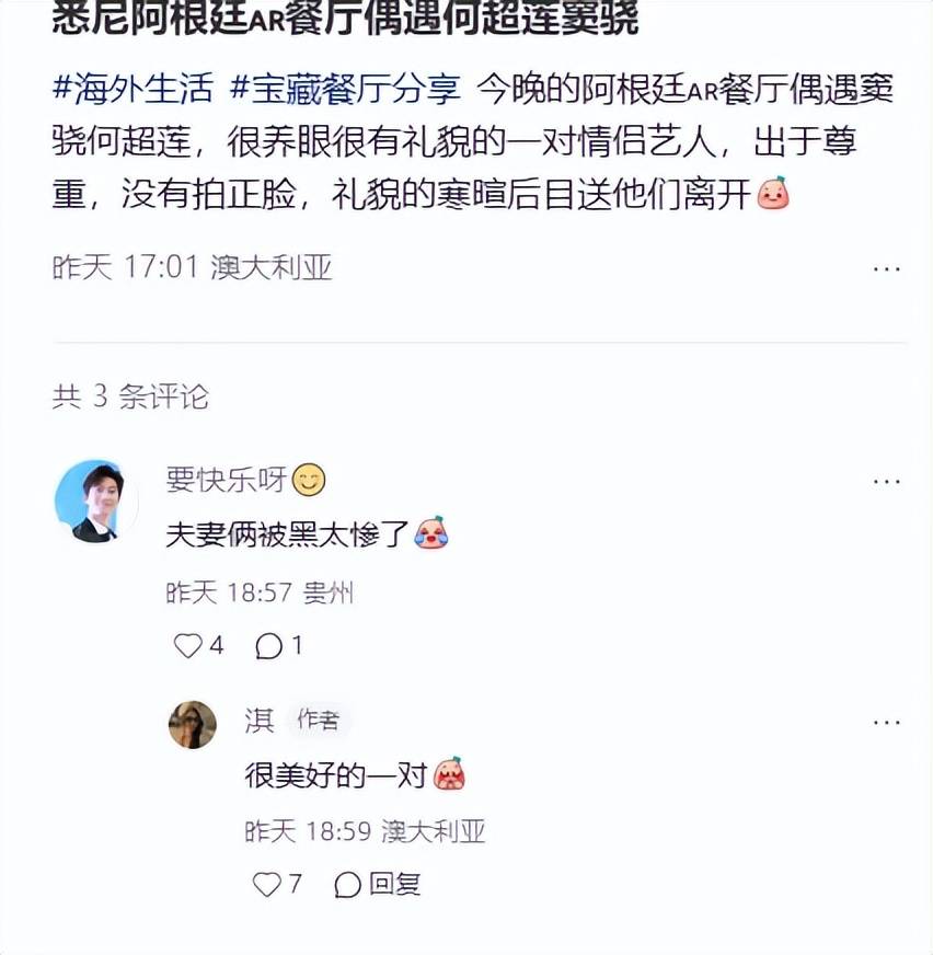 两人还一同出现在澳洲的一家餐厅里,偶遇的博主称他们是很美好的一对,不过这位博主只拍了两人的背影照,从背影照仍然看不出两人的感情有多亲昵。