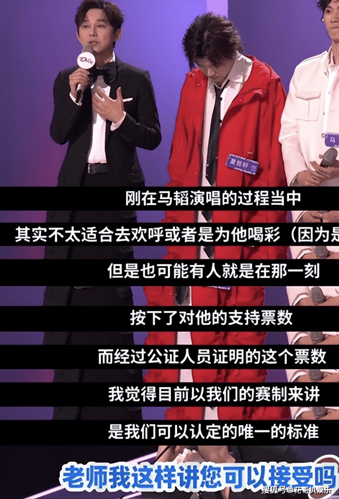 节目组赶紧请公证人员现场核验票数,确认后台数据无误后,何老师高情商紧急圆场,解释“马涛演唱时观众可能默默投票,太喜欢的歌曲反而因陌生感易吃亏”,还小心翼翼地问那英“老师,我这样解释您可以接受吗?”
