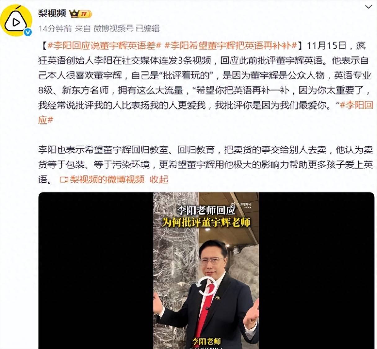 一场关于英语口语的隔空对话,将两位背景迥异的教育者推至舆论中心。11月15日,“疯狂英语”创始人李阳在社交媒体连发三条视频,对此前批评董宇辉英语一事作出回应。视频中他声称自己“很喜欢董宇辉,是批评着玩的”,并强调因董宇辉身为公众人物、英语专业八级且曾为新东方名师,更拥有巨大流量,“希望你把英语再补一补,因为你太重要了”。这位以“疯狂英语”方法论闻名的教育者,试图以“批评你是因为我们最爱你”重新定义这场争议的基调。