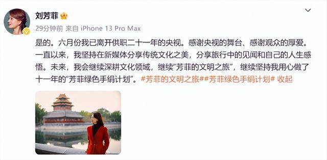 2023年6月,刘芳菲正式离开工作21年的央视,没有煽情告别,只在社交平台简单一句“感谢央视舞台,继续深耕文化领域”。