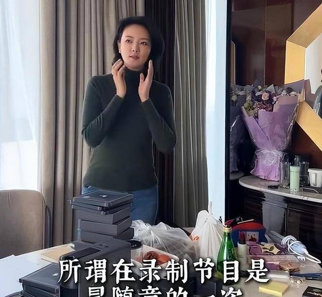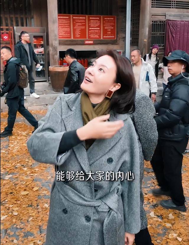 视频中,她穿着深灰色外套、佩戴深棕色耳饰的刘芳菲正在拍摄节目。