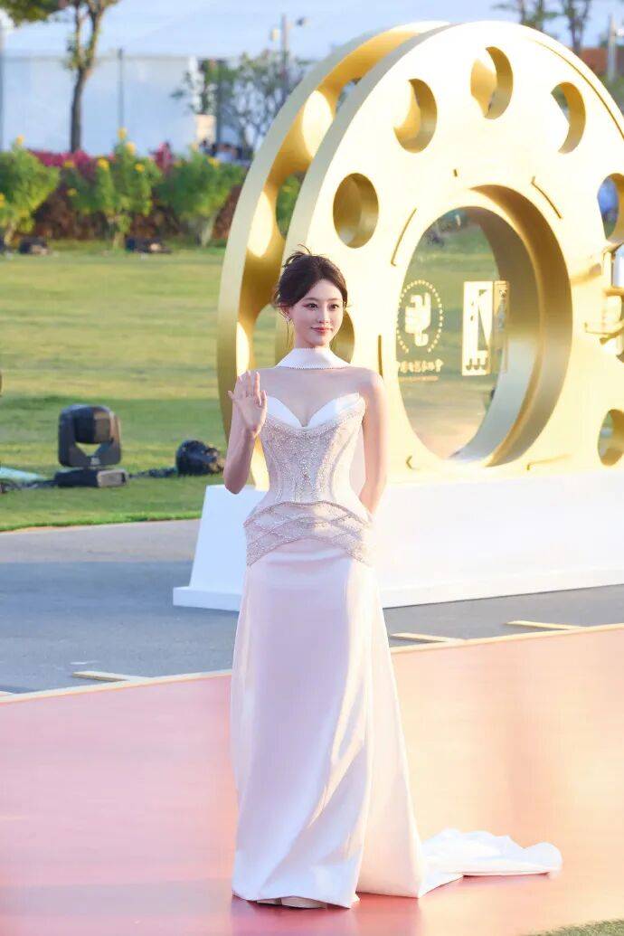 她整体造型强调"减法美学",舍弃繁复装饰,以银色流光点缀裙身,行走时光影流动,被形容为"白纱如梦的行走艺术品"。