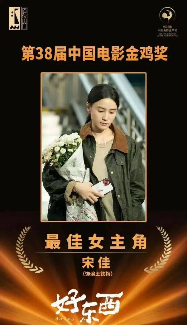 宋佳凭借电影《好东西》中“王铁梅”一角,再度获得最佳女主角,这是她继2013年《萧红》后第二次获得金鸡影后。