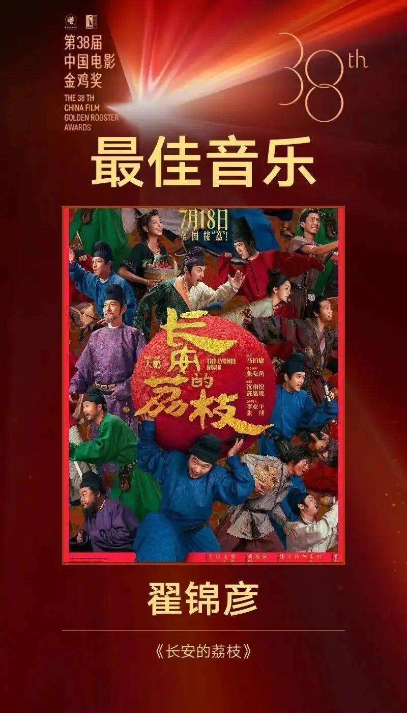 翟锦彦凭借《长安的荔枝》获得第38届中国电影金鸡奖最佳音乐奖。电影《长安的荔枝》改编自马伯庸创作的同名人气小说,该片口碑很好,可惜票房不如预期,本届金鸡奖只获得一个音乐奖项。