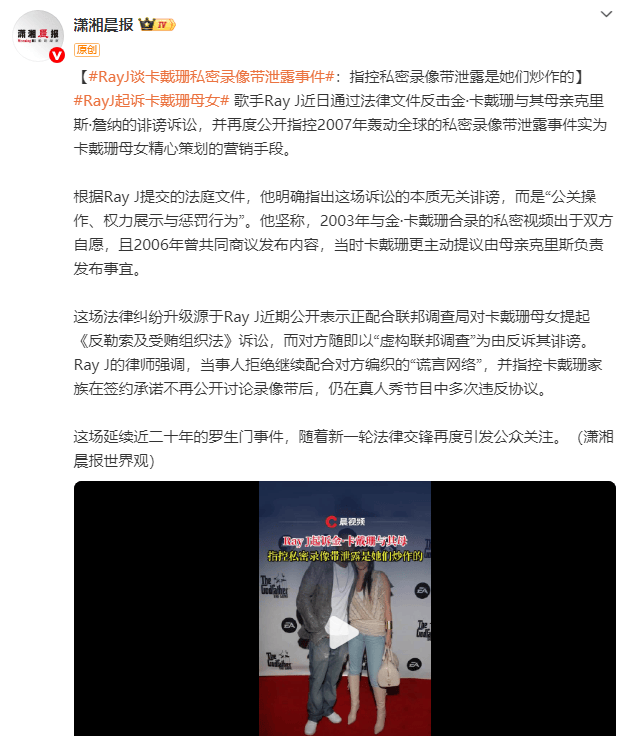 (来源:潇湘晨报)歌手Ray J近日通过法律文件反击金·卡戴珊与其母亲克里斯·詹纳的诽谤诉讼,并再度公开指控2007年轰动全球的私密录像带泄露事件实为卡戴珊母女精心