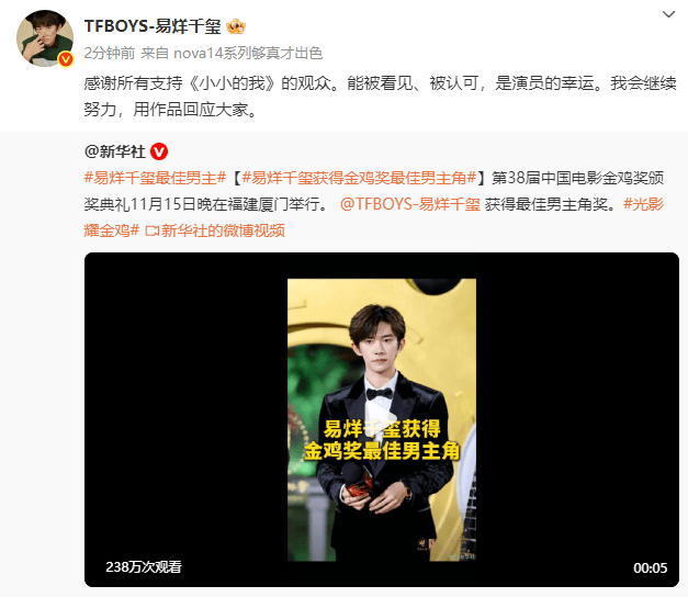 16日,易烊千玺在社交平台上发文回应获金鸡奖最佳男主角,他表示:“感谢所有支持《小小的我》的观众。能被看见、被认可,是演员的幸运。我会继续努力,用作品回应大家。&rdqu