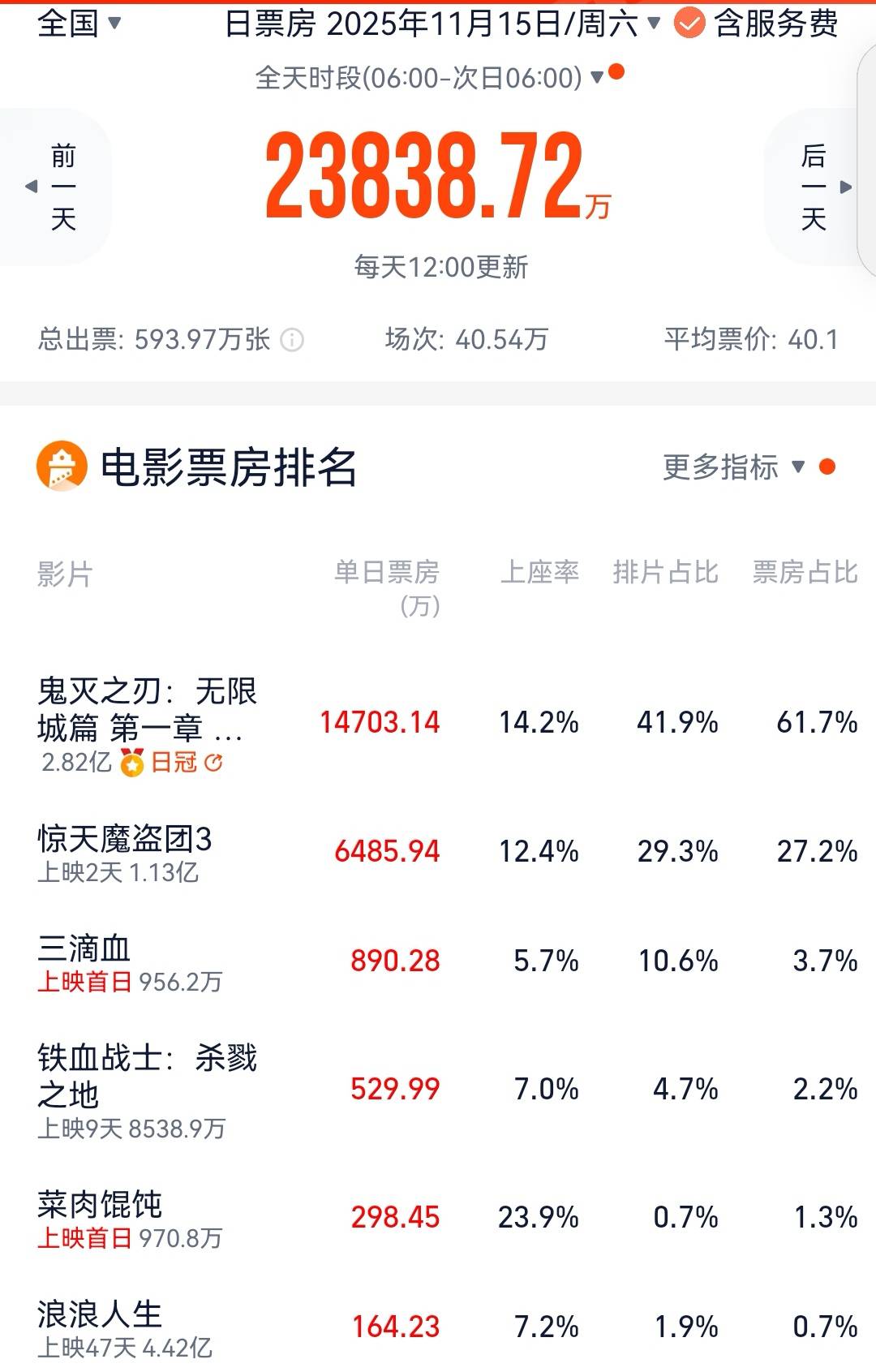 11月15日,胡歌、文淇、高子淇、闫妮、宋佳、高叶、欧豪等主演的犯罪题材剧情片《三滴血》上映,首日排片占比10.6%,收票房890万元,上座率5.7%,远不如进口片《鬼灭之刃:无限城篇 第