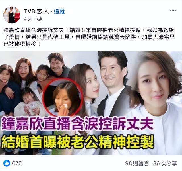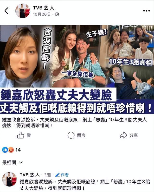 11月15号一大早,一些所谓的八卦媒体开始报道了一则关于TVB艺人钟嘉欣的报道,言辞之中满是甩锅,而且留言处也恶毒的言语,更上升到了所谓的“臆断”,认为当下的钟嘉欣已经离婚。