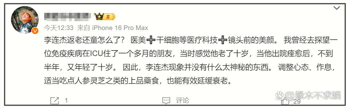 还有人认为李连杰返老还童不值得大惊小怪,医美加上美颜也很正常。只要调整心态和作息,大家都可以有效的延缓衰老。