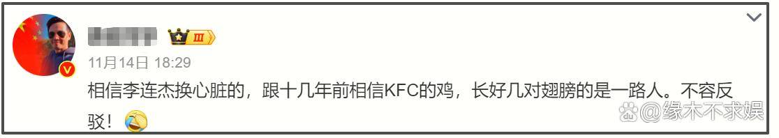 不过在李连杰参演的电影《镖人》上映日期提上日程之后,这些质疑之声忽然消减了许多,甚至还有人为李连杰发声。吐槽相信李连杰换心脏的网友,跟十几年前相信KFC的鸡长了好几对翅膀的是一路人。