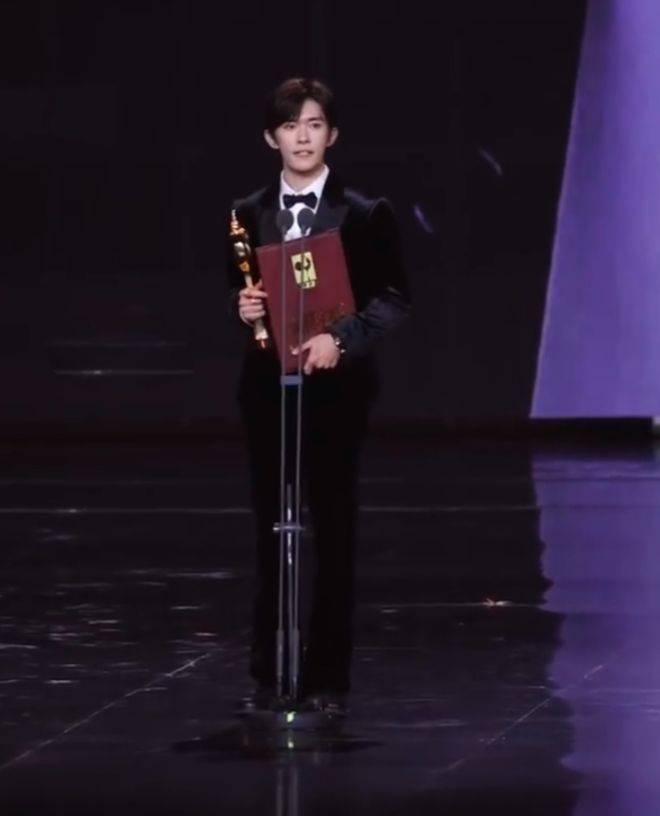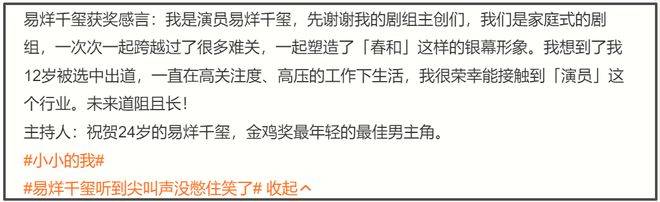 之后易烊千玺说了获奖感言,他说和家庭式的剧组一起闯过很多难关。又想到了12岁被选中出道,一直在高关注度、高压的工作下生活。最后也不忘憧憬下未来,称未来道阻且长。