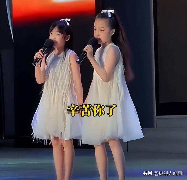 双胞胎女儿由保姆照管坐在右侧,两人正专注观看舞台方向。