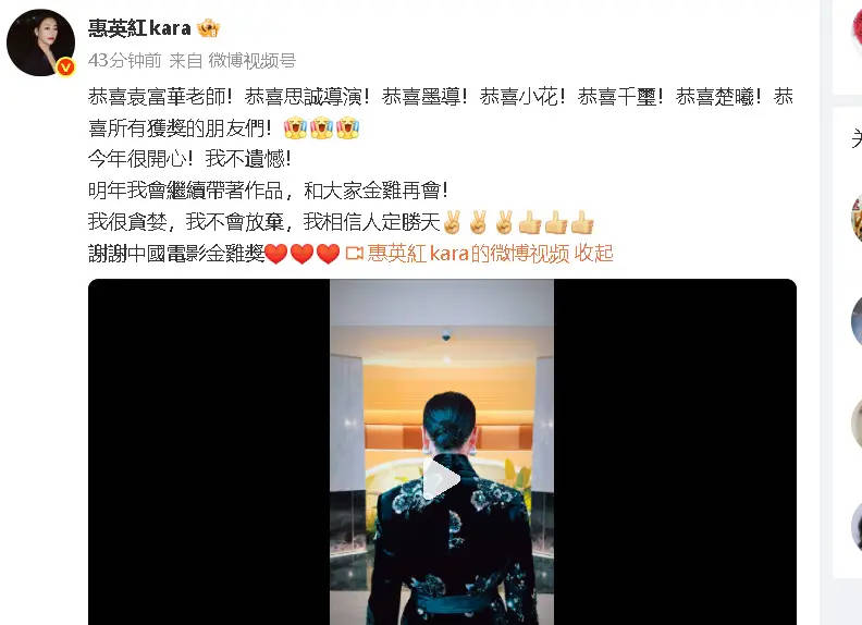 近日,惠英红在金鸡颁奖典礼后发文称自己今年很开心,并不遗憾,她还表示:我很贪婪,我不会放弃,我相信人定胜天。