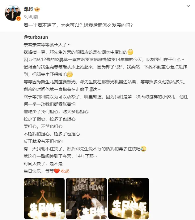 13日,演员孙俪发布长文为儿子等等庆祝14岁生日。丈夫邓超看到这篇饱含温情的庆生文后,随即转发并俏皮回应:“看一半看不清了,大家可以告诉我后面怎么发展的吗?”一句