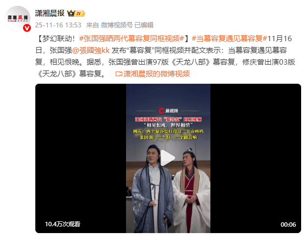 (来源:潇湘晨报)11月16日,张国强发布“慕容复”同框视频并配文表示:“当慕容复遇见慕容复,相见恨晚。”据悉,张国强曾出演97版《天龙八部》慕容复,修庆曾出演0