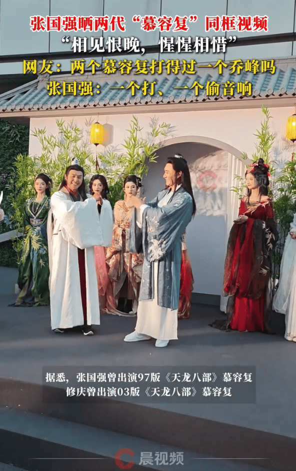 11月16日,张国强发布“慕容复”同框视频并配文表示:“当慕容复遇见慕容复,相见恨晚。”据悉,张国强曾出演97版《天龙八部》慕容复,修庆曾出演03版《天龙八部》慕容复。