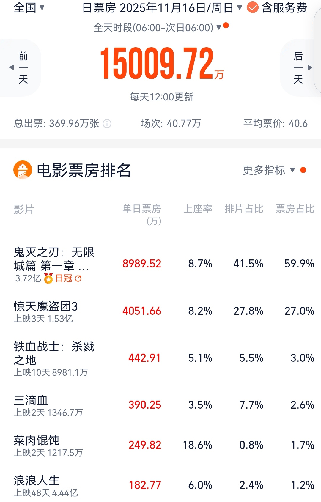胡歌、文淇、高子淇、闫妮、宋佳、高叶、欧豪等主演的犯罪题材剧情片《三滴血》上映首日票房890万元,次日跌到390万元,两天累计1347万元,上座率远不如两部进口新片《鬼灭之刃:无限城篇 第一章》和《惊天魔盗团3》,预计其最终总票房可能落在3000万元上下。